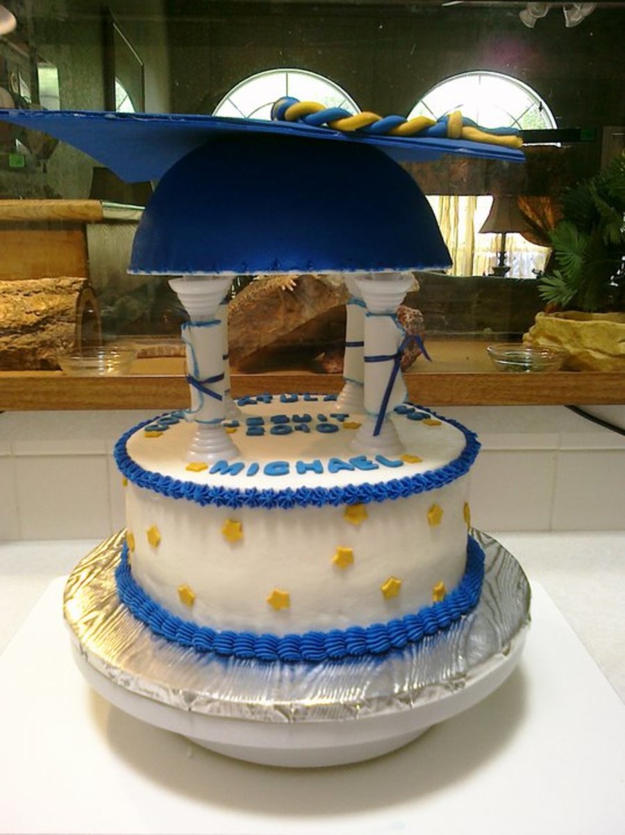 All buttercream with fondant accents. Pillars are covered with fondant and made to look like diplomas.