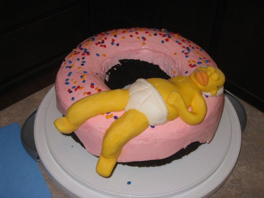 This was for a friend's college graduation. He wanted a Homer cake. This is Homer, asleep and dreaming of a GIANT doughnut