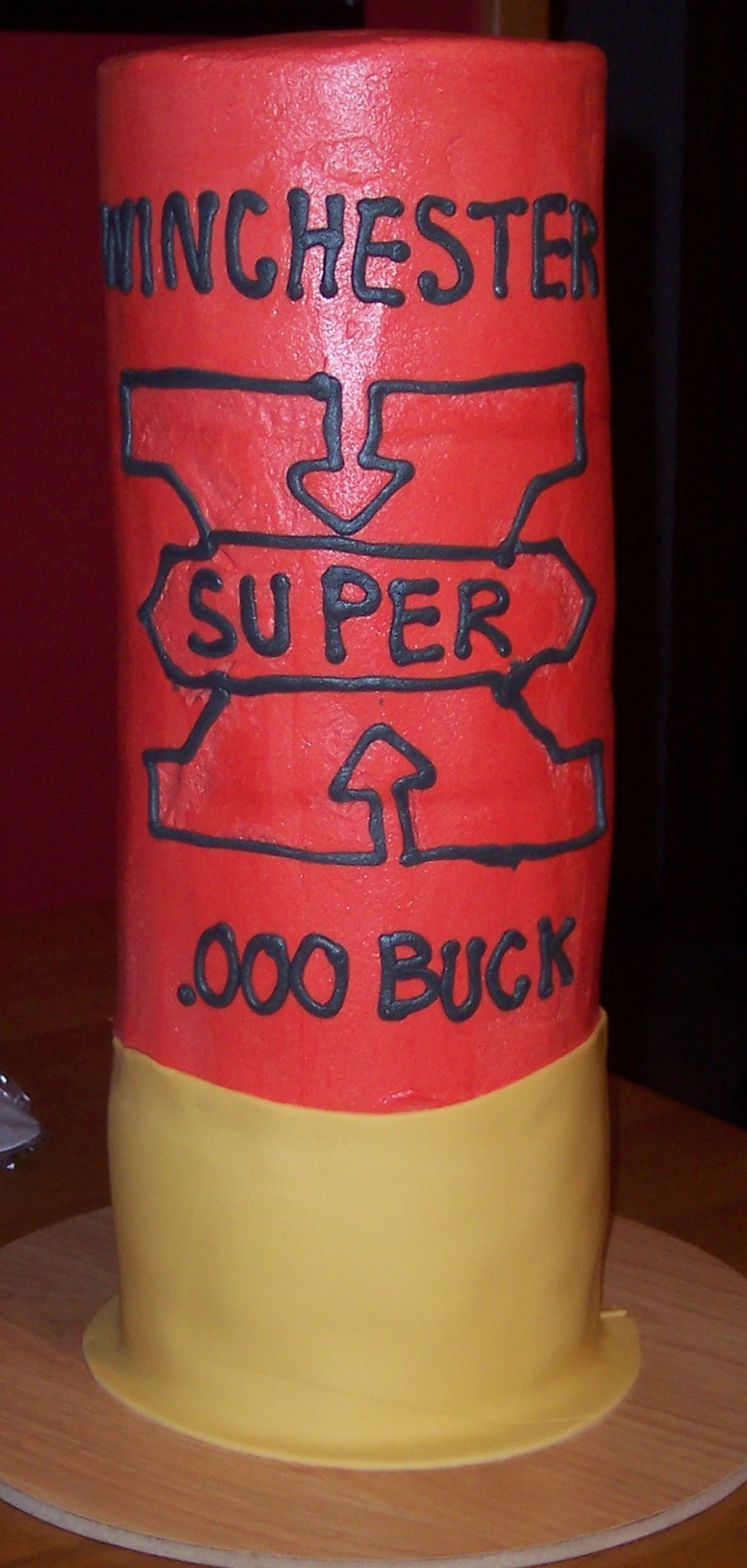 Really tall shotgun shell cake! This was fun! 4 2 layer 6" cakes stacked on a dowel that was secured to the wooden stand.