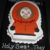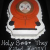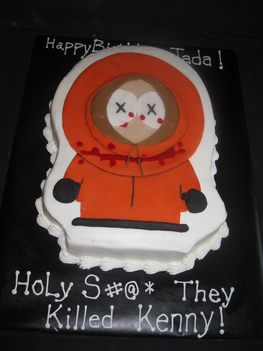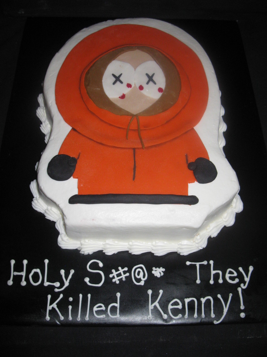 Cut from a 1/4 sheet red velvet cake with buttercream icing. Kenny is fondant, and the blood is corn syrup with gel color. I made this for a friends teenage daughter who plans to stick a knife in his neck before serving