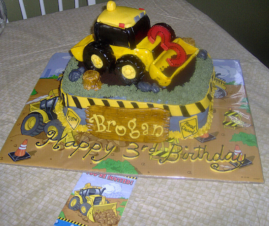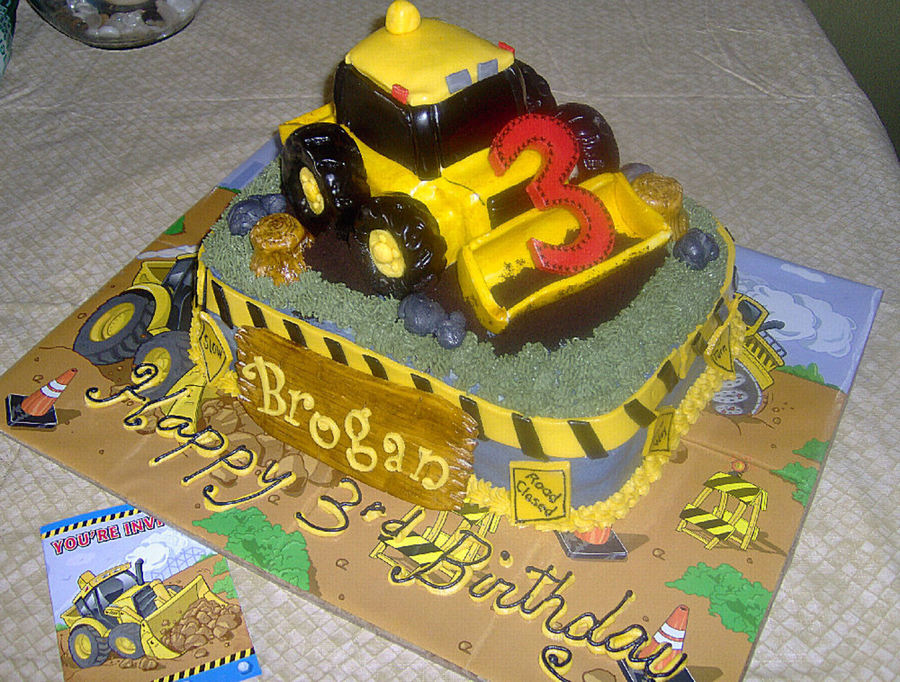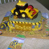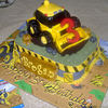Just finished, marble cake with buttercream filling, covered with buttercream, rice krispie treat tractor covered with fondant and fondant accents, tried to match the invitation as best I could.