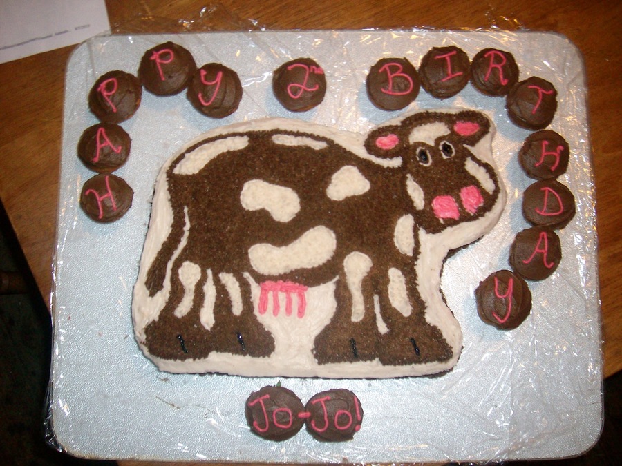 first time free handing a cow. I got this idea from a similar cake on CC. I used an 11x15 sheet pan and carved out the shape and used mini cupcake pan for the cupcakes.
