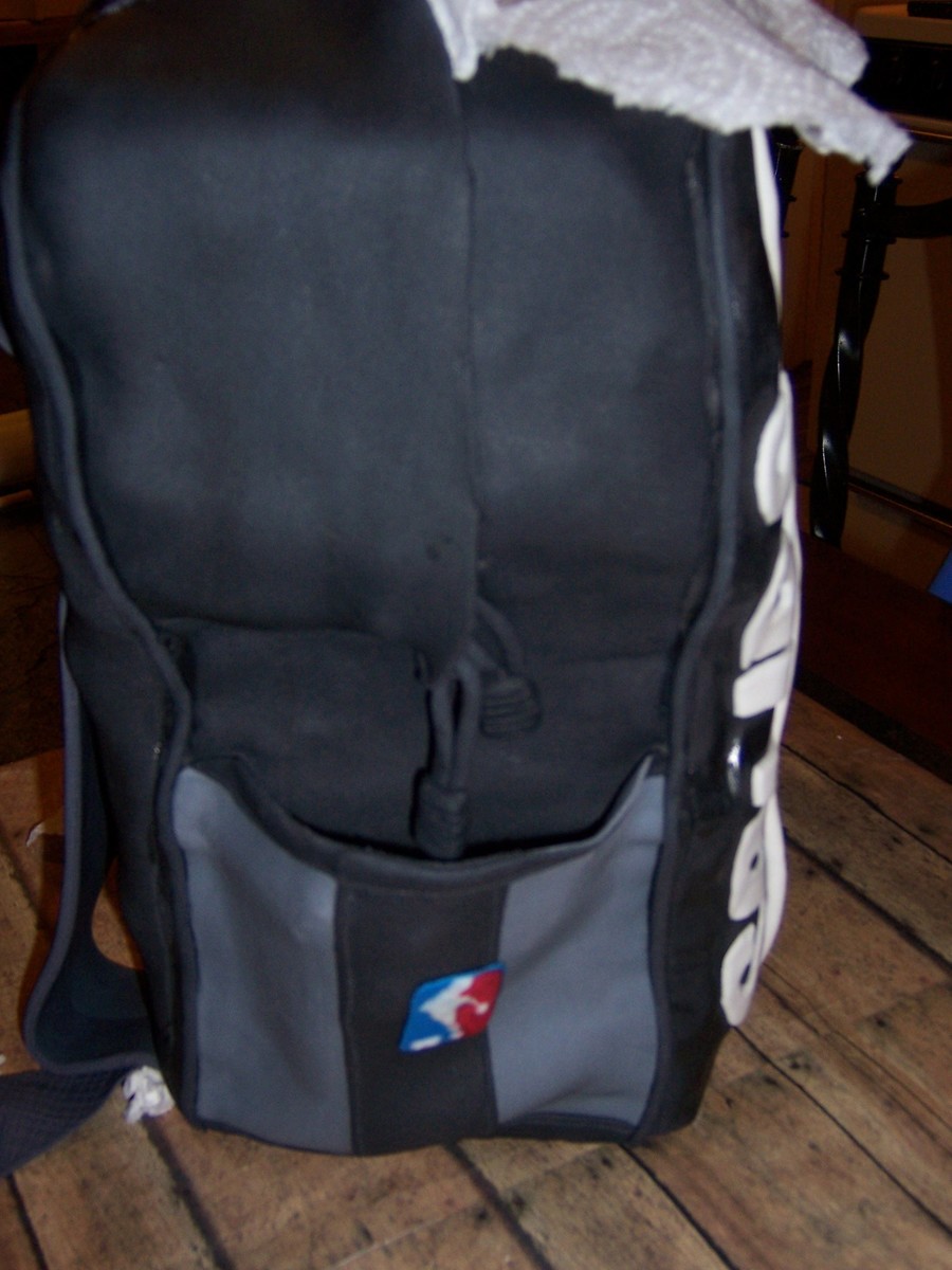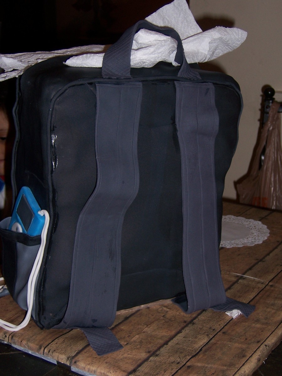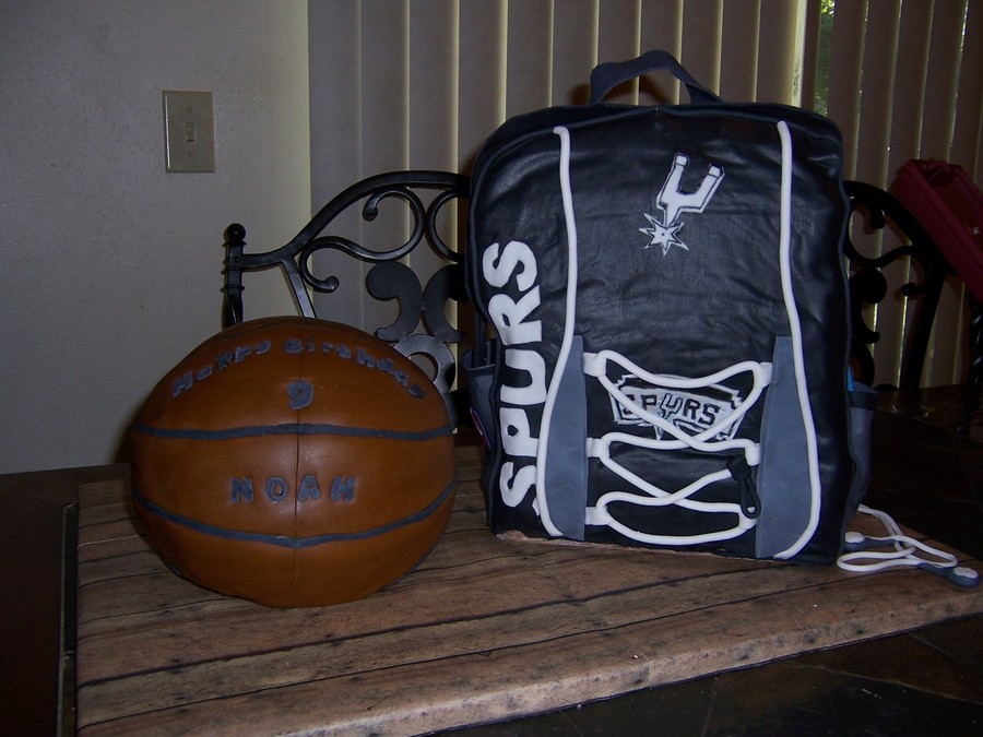 Frist I would like to thank all the ladys who gave me tidbits of wisdom in making this 3D. The bag is nine layers tall with card board inbetween every two layers. Three dowels go all the way down the middle. I tryed it the normal way for stacked cakes but it just feel over in the fridge before I had covered it in fondant so I restacked it and this is how i was able to make it stand. Most every thing is fondant except the straps and letters they are gum paste. I found a tool called a clay extruder (gun) at hobby lobby that made it much easier to get the trim and basket ball lines. Thanks for looking.