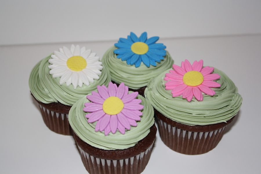 I made these cupcakes just because! I made some with a different design for my sister, and decided to experiment with the leftover cupcakes! Gumpaste gerbera daisies, iced in buttercream.