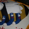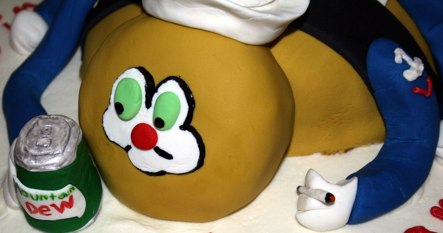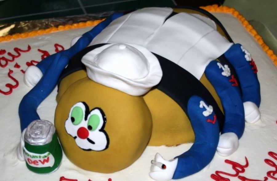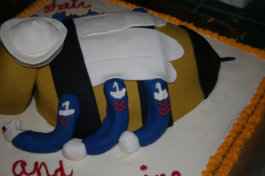 US Navy Seabee made for a Sailor re-elistment party. Instead of tools bee is holding a Mountain Dew. Bottom cake is buttercream. Seabee is covered in fondant.