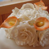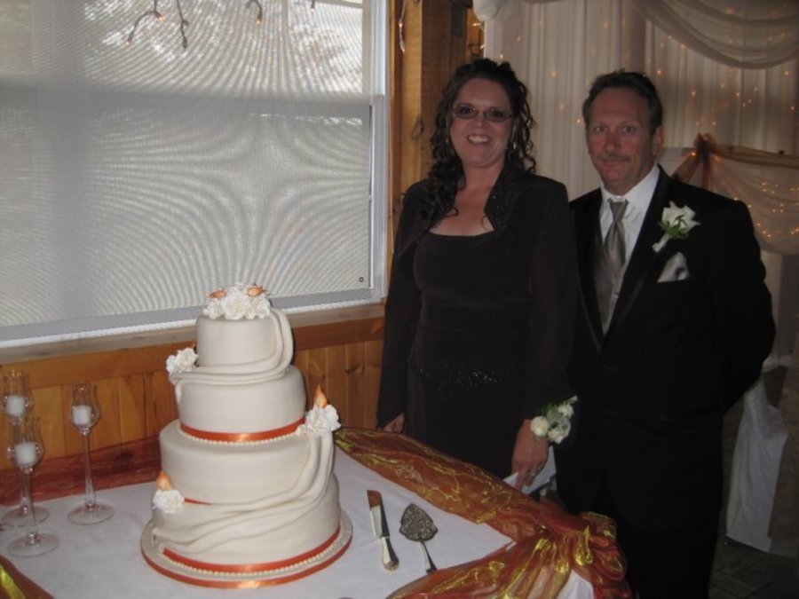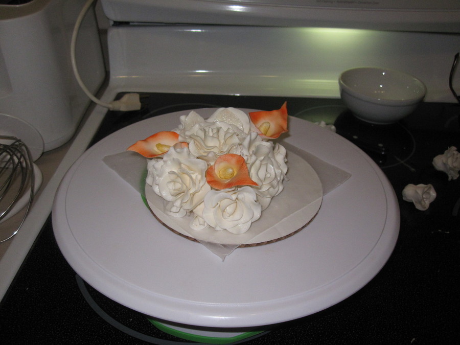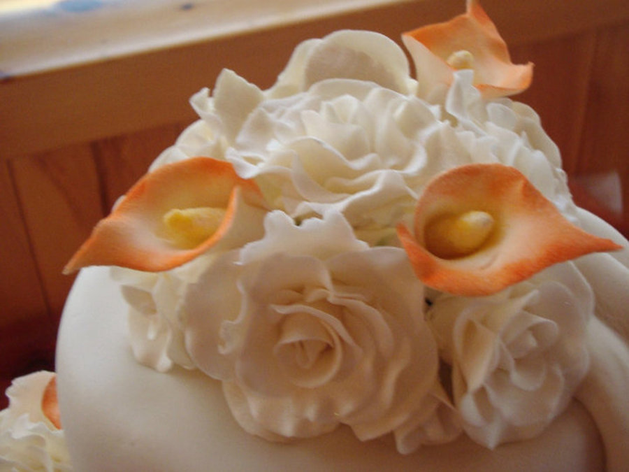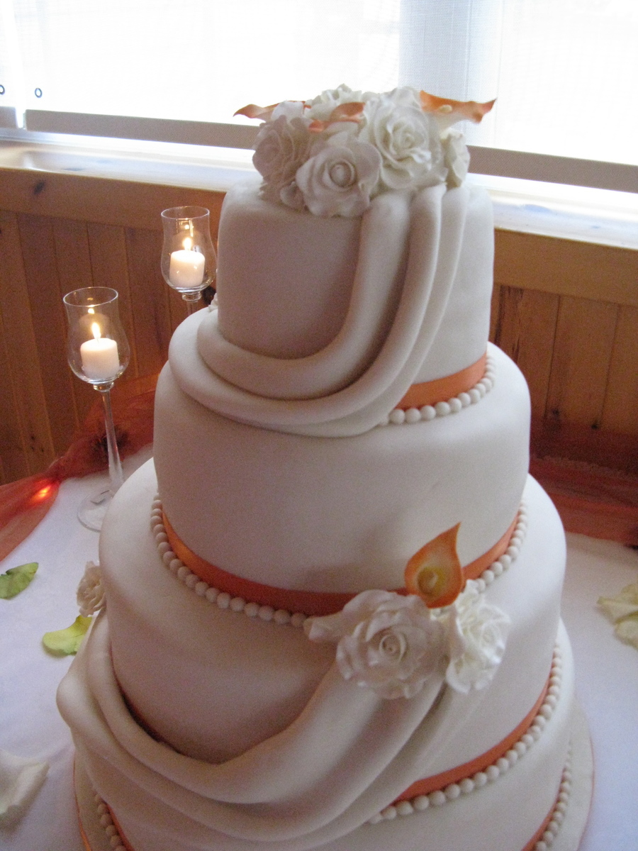 I made this cake for my son's wedding Aug 7, 2010 - 4 tier - top tier Mocha cake, next layer white cake with lemon filling, white cake with buttercream filling, bottom layer is chocolate cake with buttercream icing covered in fondant - gum paste flowers