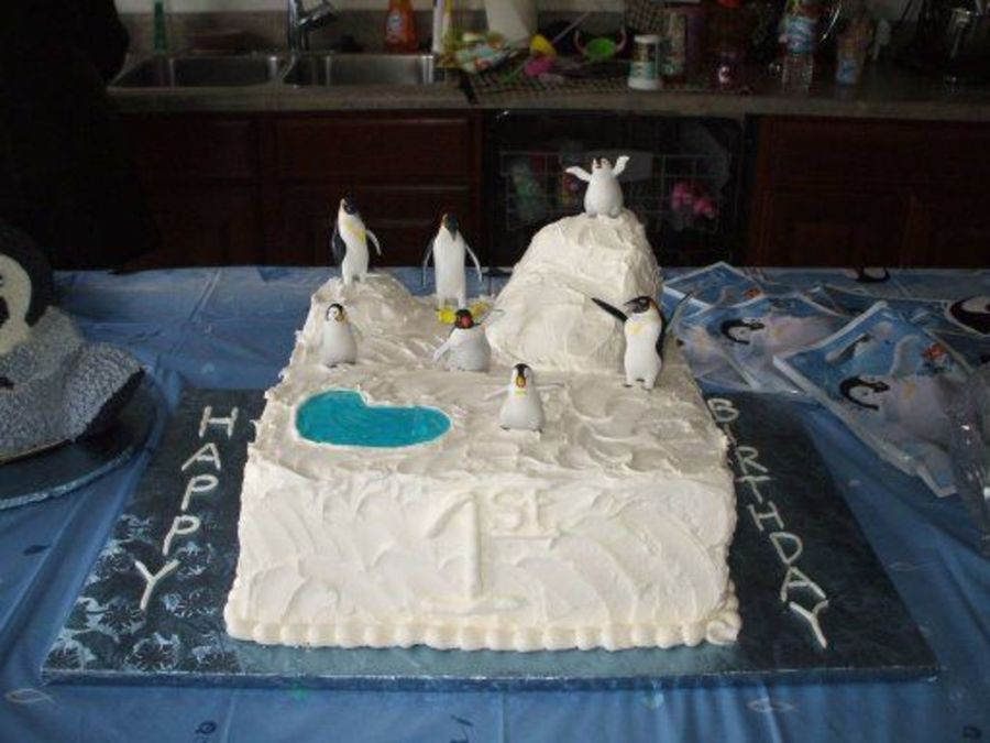 This was the cake for the guests to go along with Mumbles. It was two 12 inch square cakes stacked (one vanilla, one chocolate) and iced in buttercream. I used the Happy Feet figurines I found at a toy store on top! The gal I made this for, her 2 1/2 year old daughter decided to "try" the icing before we got pictures! See the little smudge in the corner of the border? LOL