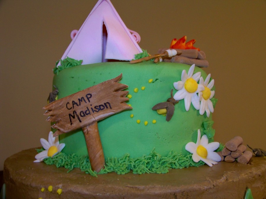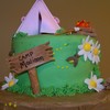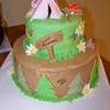 10" cake with buttercream; 6" cake covered in MMF. MMF trees/ flowers. Gumpaste everything else. This cake was for a little girl's 8th birthday camping party.