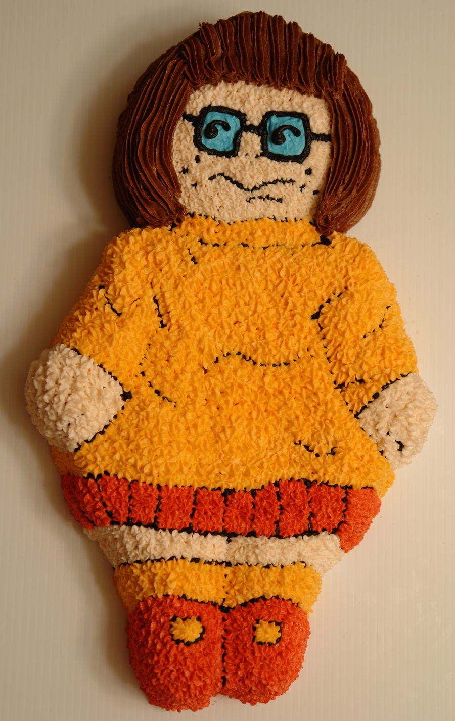 Made my own birthday cake again this year. Considered doing the Mystery Machine from my 70's van pan but at the last minuted opted for my favorite and sometimes look alike, Velma. She's a butter yellow cake with buttercream frosting created from the Storybook Doll pan.