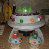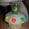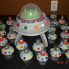 This creation was done for my son's 5th birthday party. My husband made the cake board/ufo platform so when I made an 8" single layer cake to sit on top of it, the whole thing would look like a UFO (a.k.a. the mothership). I then trimmed the bottom of the cake with silver Mardi Gras beads as well as red beads around the plastic dome. Large "lights" around the UFO cake are gumball. The alien men inside are from a party supply store. All of the cupcakes are topped with buttercream frosting and M & M's to look like lights. The aliens are finger puppets from a local craft store and the "lids" of the UFO's are little (shot glass) cups from a party supply store.
