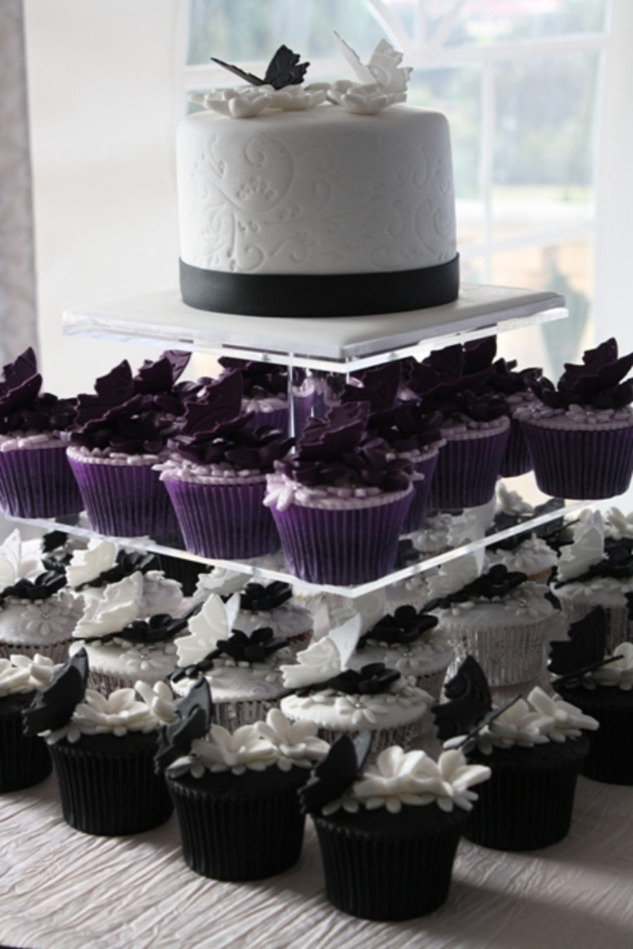 2 x 3 inch high White Chocolate Mud Cakes with Baileys - Torted into 6 layers and filled with Baileys Milk Chocolate Ganache. 4 Dozen Assorted Cupcakes = Fresh Vanilla Bean, Dark Chocolate, and Whitr Mud All decorated with Frangipani Flowers and Butterflies. Colours used - Aubergine, Mauve, Black & White.