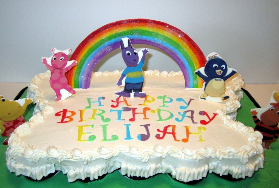 Chocolate cupcake cake with ganache filling and Easy No-Cook Meringue icing. Gumpaste rainbow and chocolate transfer characters. I had a very difficult time with the coloring on the chocolate transfers, for some reason. Thanks for looking!