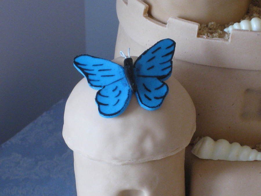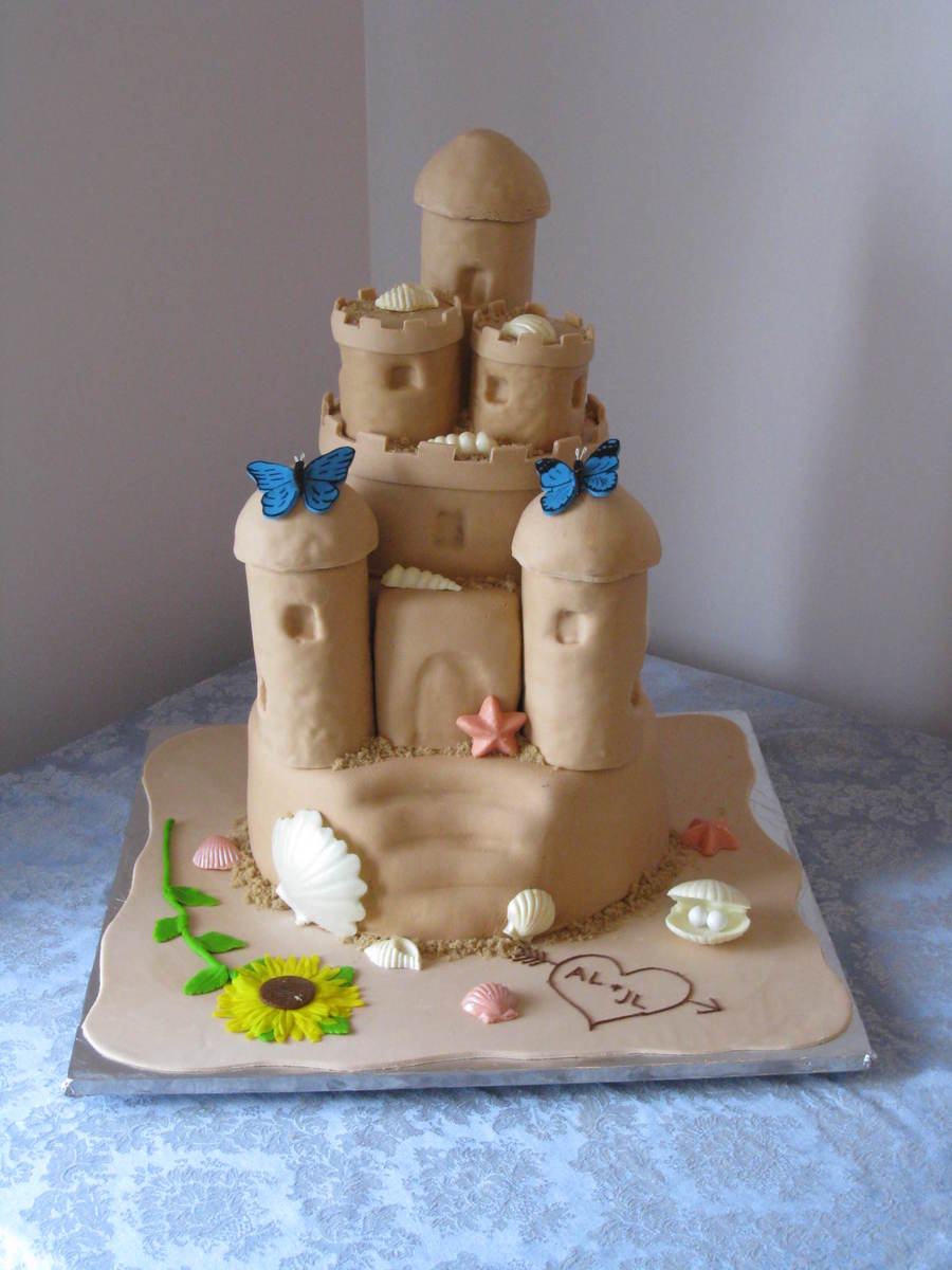 This is my first wedding cake. The cakes are (from top to bottom) Red Velvet, French Vanilla and Dark Chocolate. They are covered in MMF tinted to look like sand. The towers are made from Rice Krispies and covered in MMF. The Shells, Butterflies and Sunflower are Chocolate and MMF. The sand is Light Brown Sugar. Thank you to 2muchsugar for the inspiration.