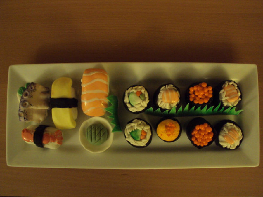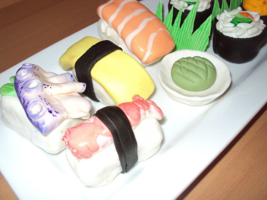 I'm in the process of making a sushi bento box birthday cake for a friend who loves sushi. I only have the sushi made so far, cake is waiting to be iced and for the panels to dry. I thought it would be fun to plate the sushi and take a progress pic:) The sushi is made out of MMF, rice crispy treats and chocolate fudge cakeballs. I used a 50/50 solution of vodka and corn syrup to make a glaze for the shiny pieces. TFL!