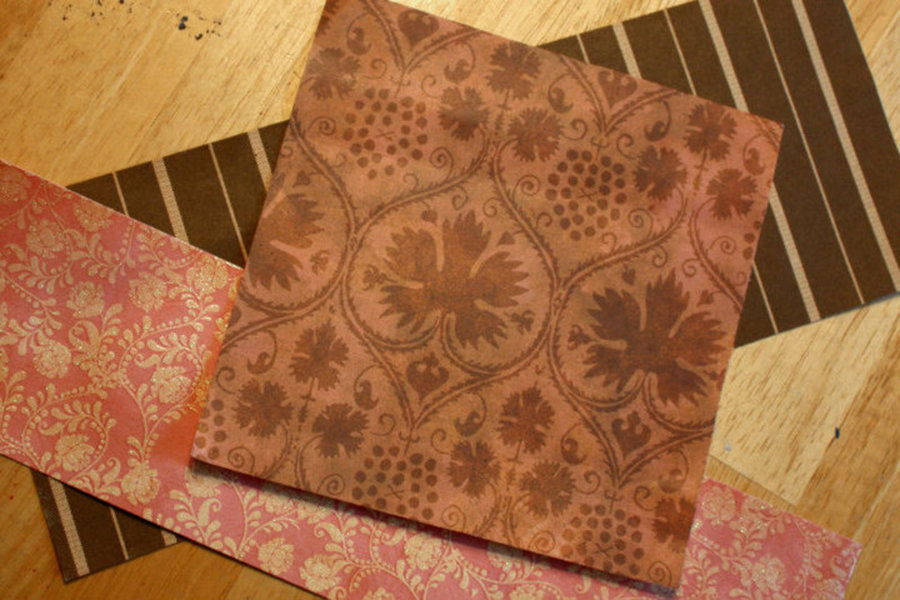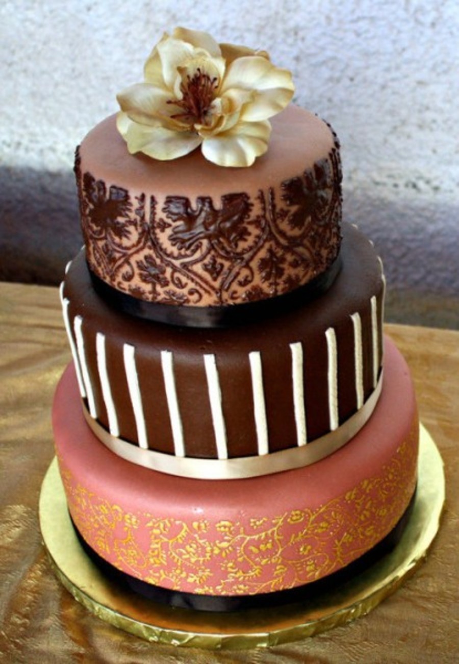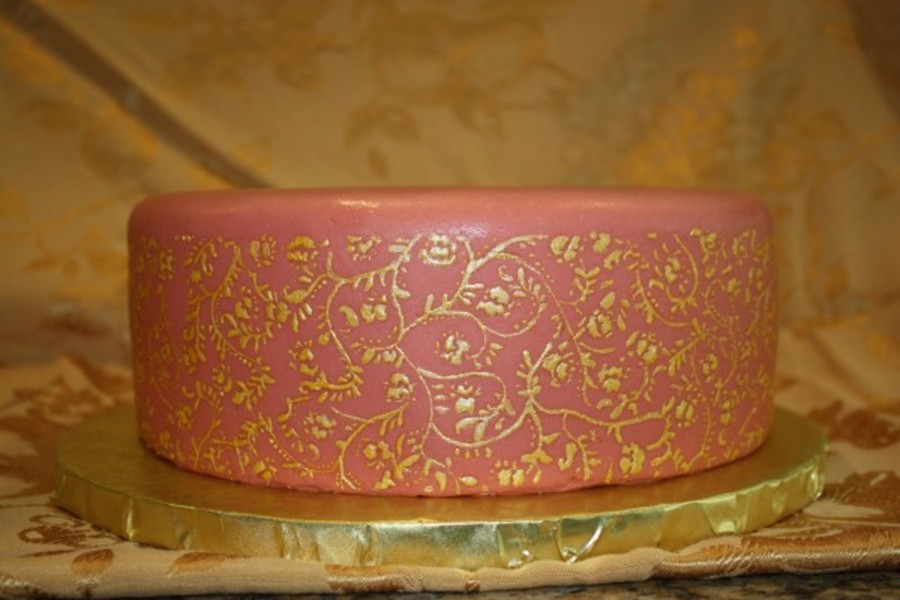 This cake was made for my aunt, who is an avid scrapbooker, so we found some scrapbook pages that reminded us of her style and made a cake out of it! It's all fondant. The top tier has piped chocolate on the fondant, the middle tier has fondant lines attached, and the bottom tier is hand painted with yellow luster dust.
