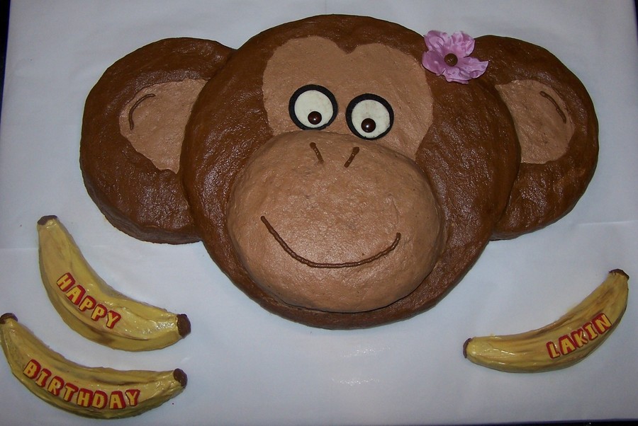 Monkey cake is made with a large round white cake and 2 small round chocolate cakes (cut to sit against the large round). The bananas were made out of small round banana cakes and frosted with cream cheese icing. They were hand-painted to look like real bananas.