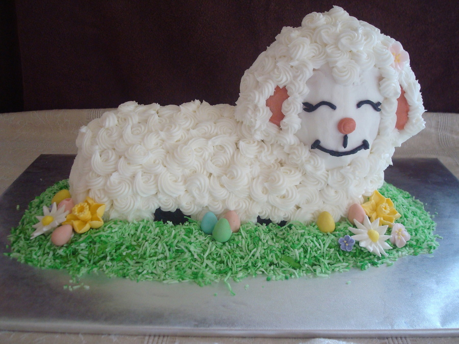 Easter lamb cake. White cake with lemon filling. Buttercream icing, royal icing flowers coloured coconut and mini eggs.