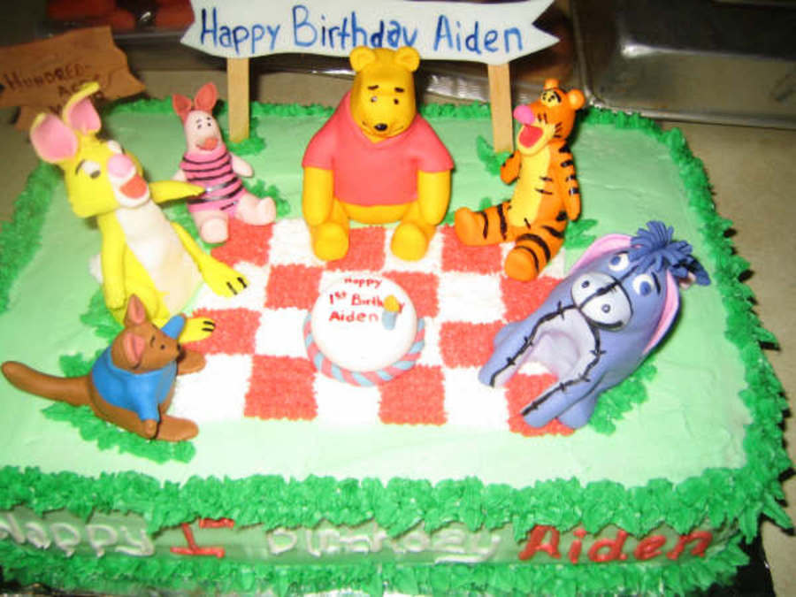 Winnie the pooh 1st birthday cake, 1st attempt at fondant figures. Cake is buttercream frosted.