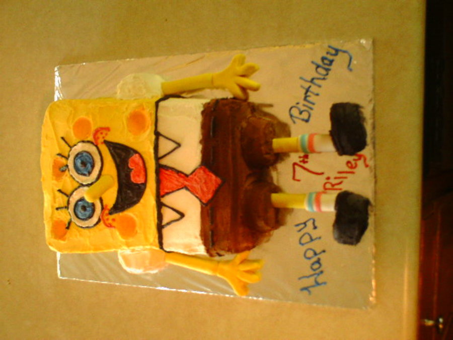Birthday cake for a young boy that really likes spongebob. Buttercream frosted, fondant covered pretzel rods used for arms, legs and nose. Feet are made of cupcakes.
