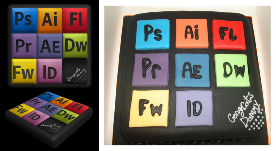 Cake was designed by multimedia graduate - keys are acronyms of software he works with...PS - Photoshop ...FW- fireworks etc - His pic is on the left and my cake on the right!