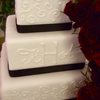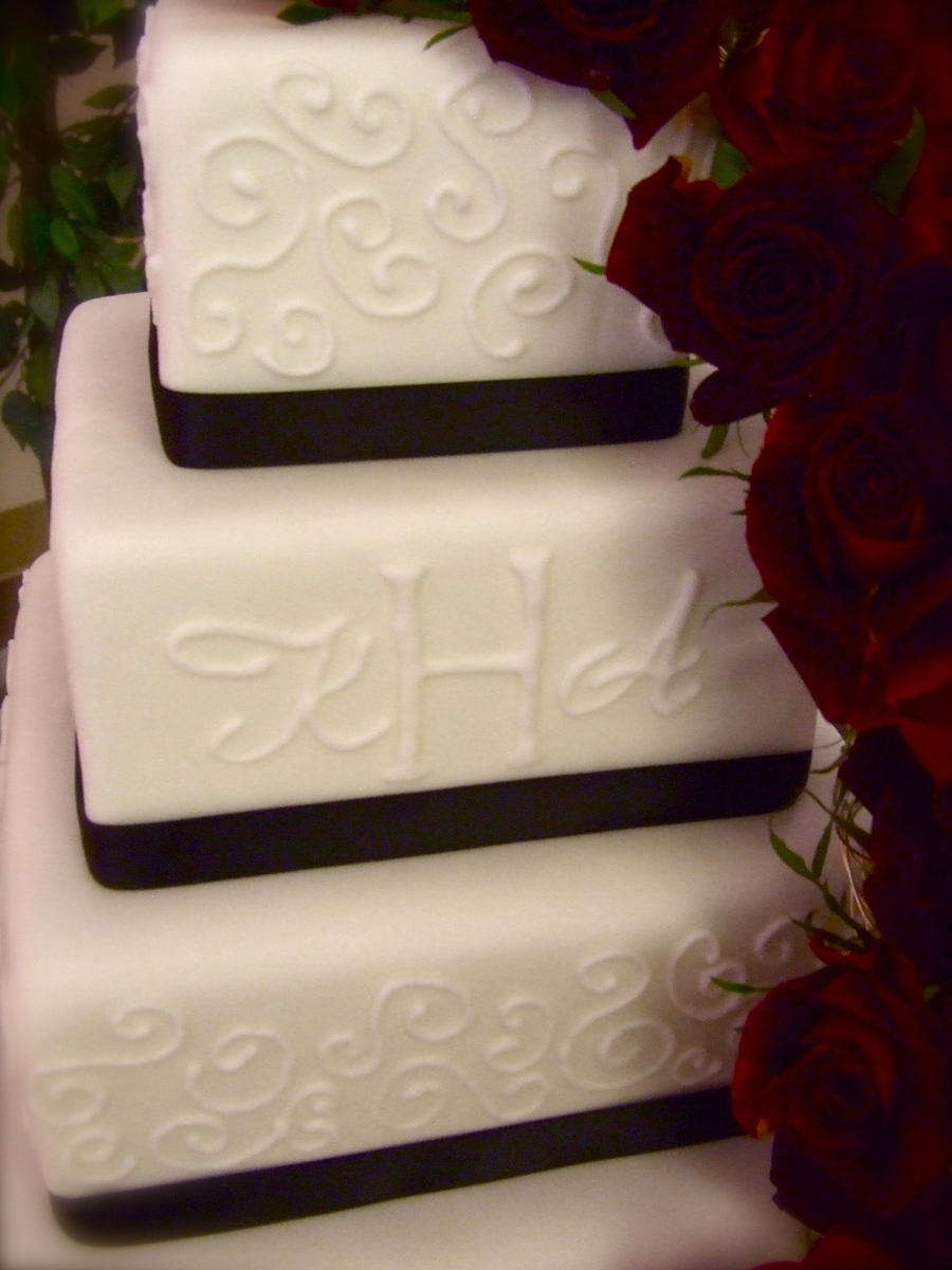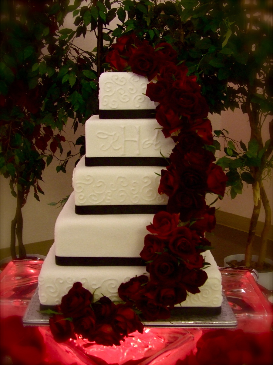 Top 2 tiers are styrofoam and the bottom 3 are cake. The flowers are real, wired into a cascade and attached to the top styrofoam tier. Monogram on the 2rd tier and swirly piping on the 1st, 3rd and 5th tiers.