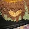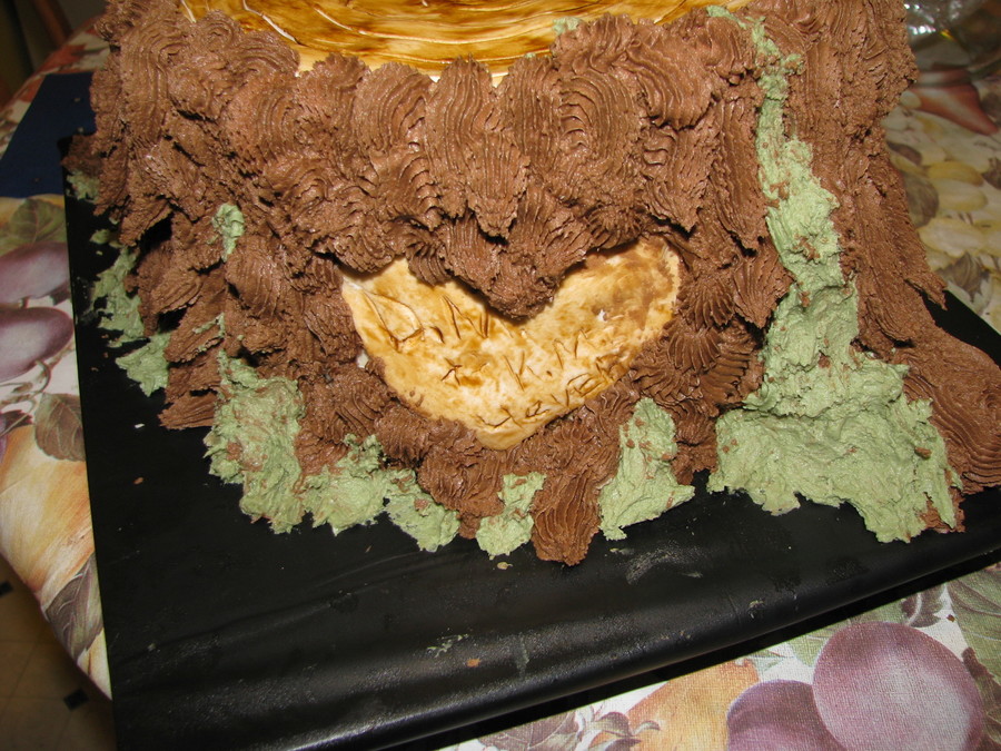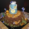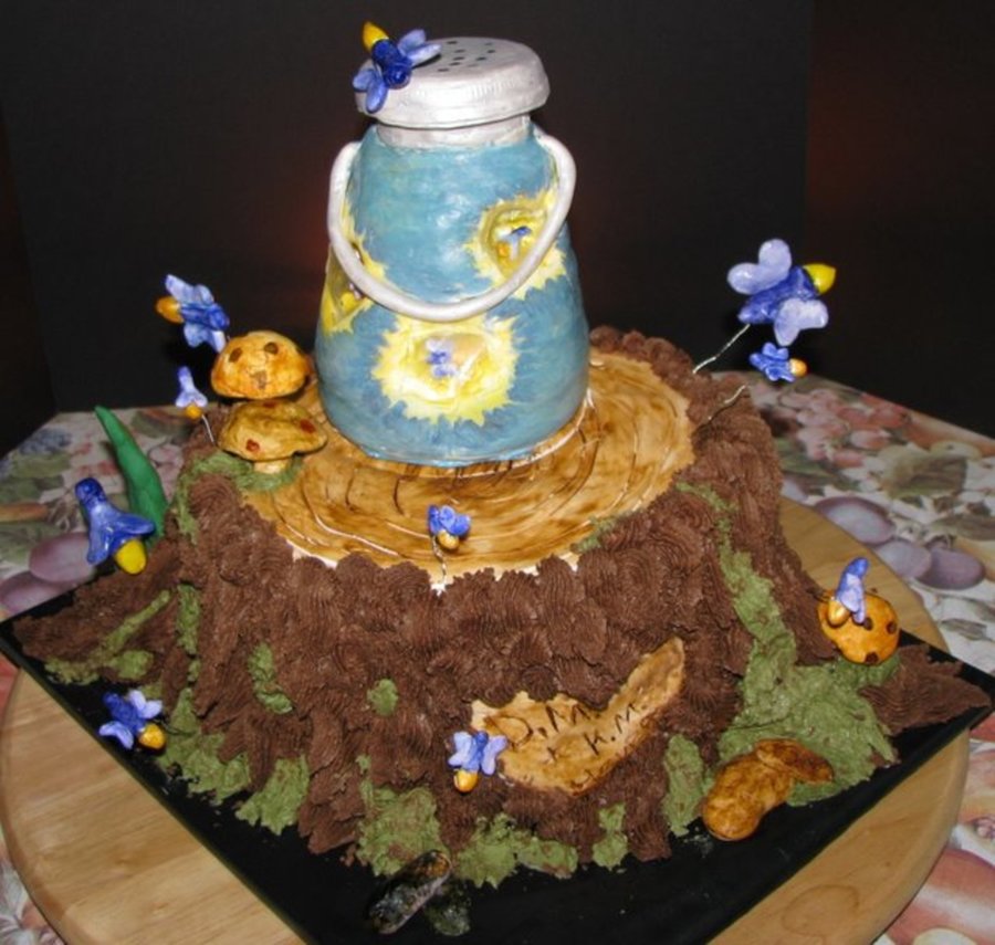 This is a 2 tiered cake. The tree stump is buttercream bark, fondant top and heart. The firefly jar is cake surrounded in fondant with a gumpaste lid, gumpaste fireflies (inside the cake) covering the fireflies is isomalt (glass) (first time using it) to give it a looking into the jar appearance. Mushrooms and rocks are gumpaste, tall grass on side of stump is modeling chocolate (first time using it).