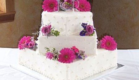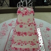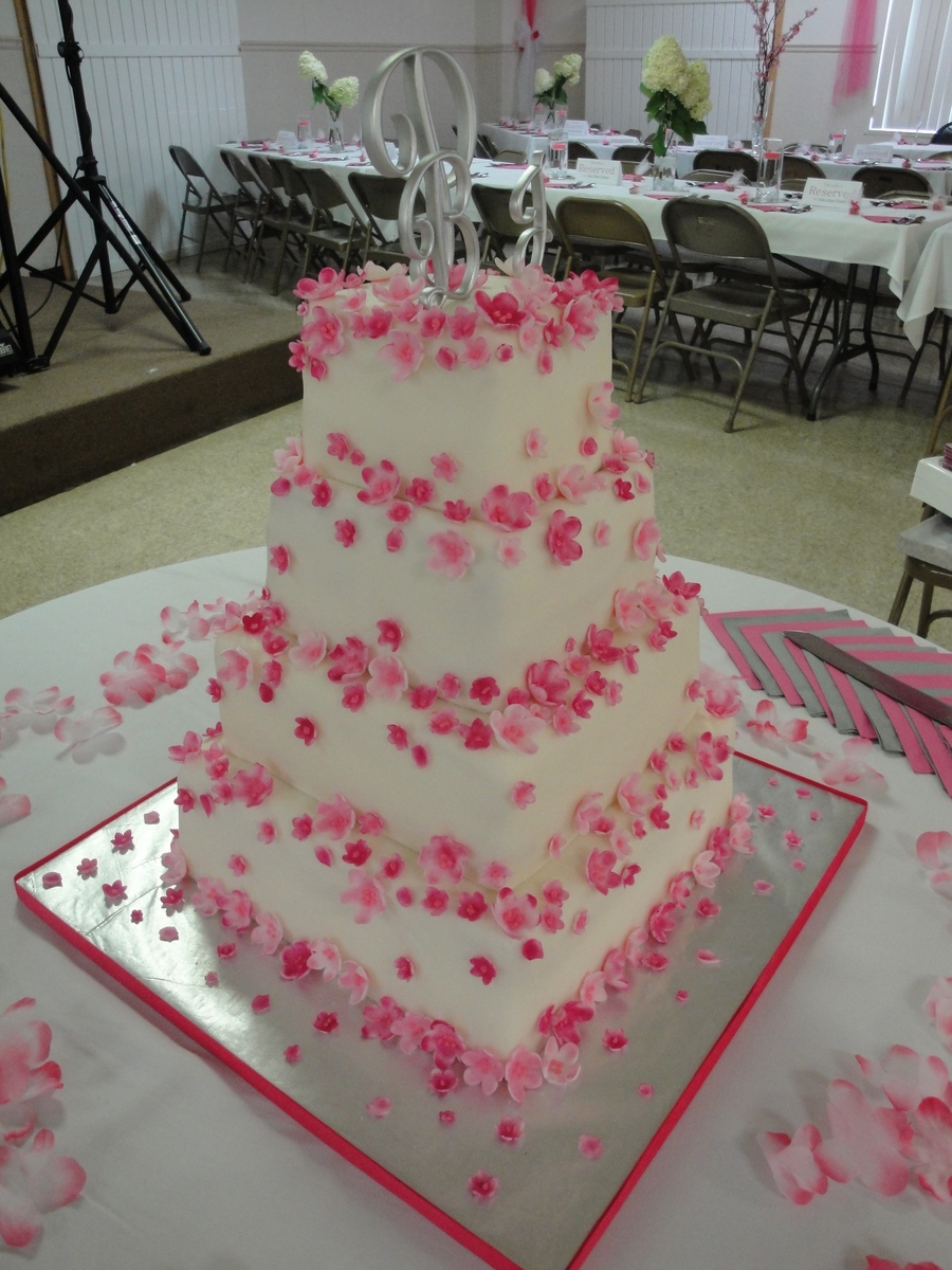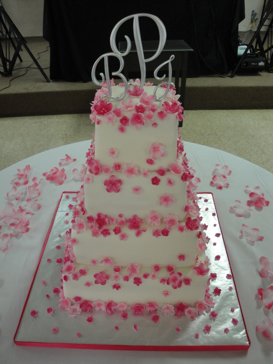 4", 6", 8" & 10" covered with white chocolate fondant accented with handmade cherry blossoms painted handpainted with petal dust