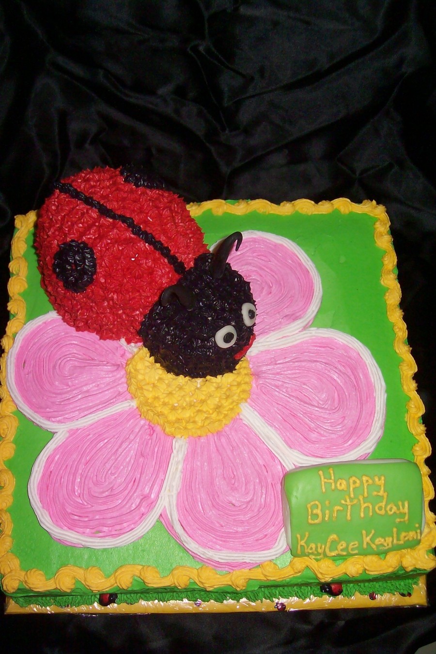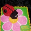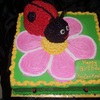 Buttercream cake with buttercream LadyBug. Carved the ladybug and iced it. Then iced the full cake. Sat the Ladybug on top. Fondant accents and antennae.