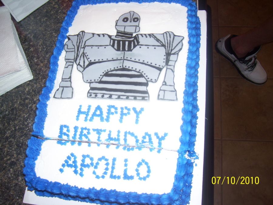 I made this for my son's 5th birthday. He begged for iron giant for months. the first pic i wasn't done with it yet but wanted to get a good pic of the iron giant. Second one i forgot to take a picture of it before i started cutting into it!