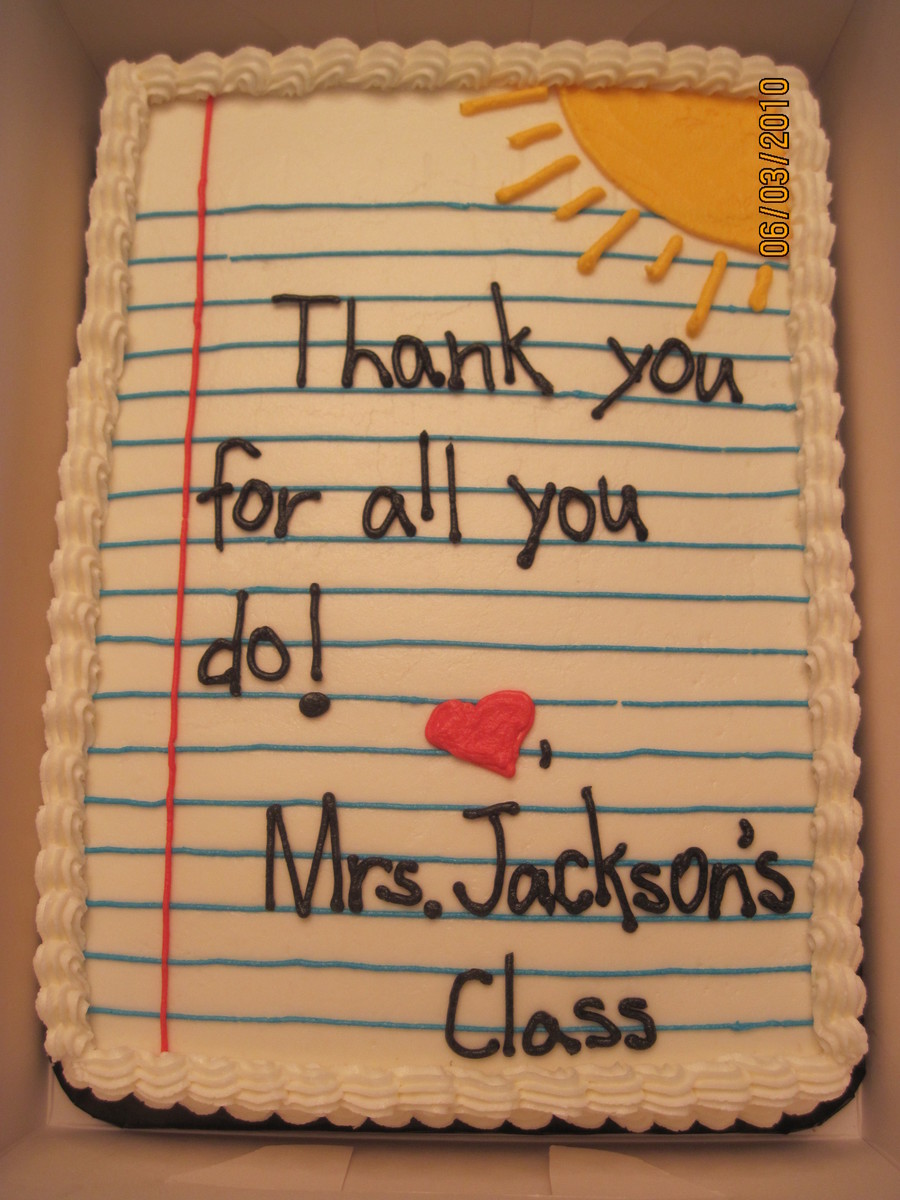Half Sheet Cake iced in Buttercream. Given as end of the year gifts to the "unsung" heros in my childrens school...the office staff, cafeteria staff, custodial staff and the REACH teachers (Art, Music, PE and Spanish).