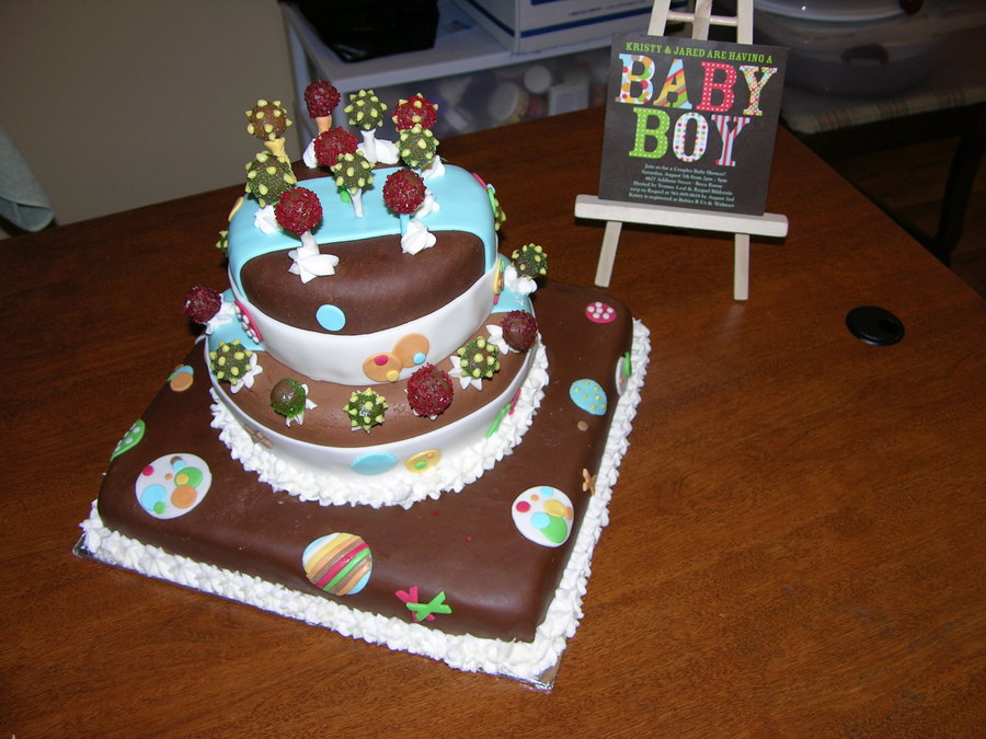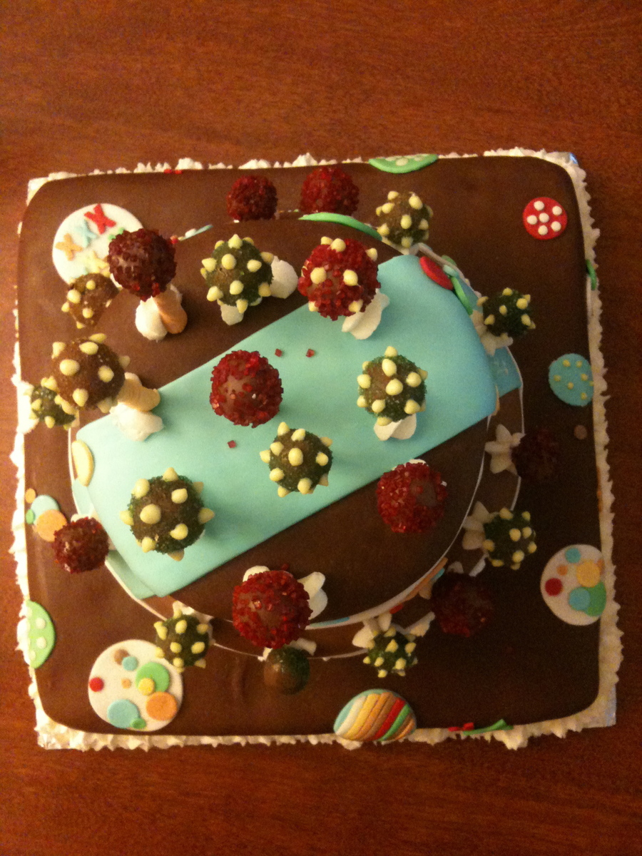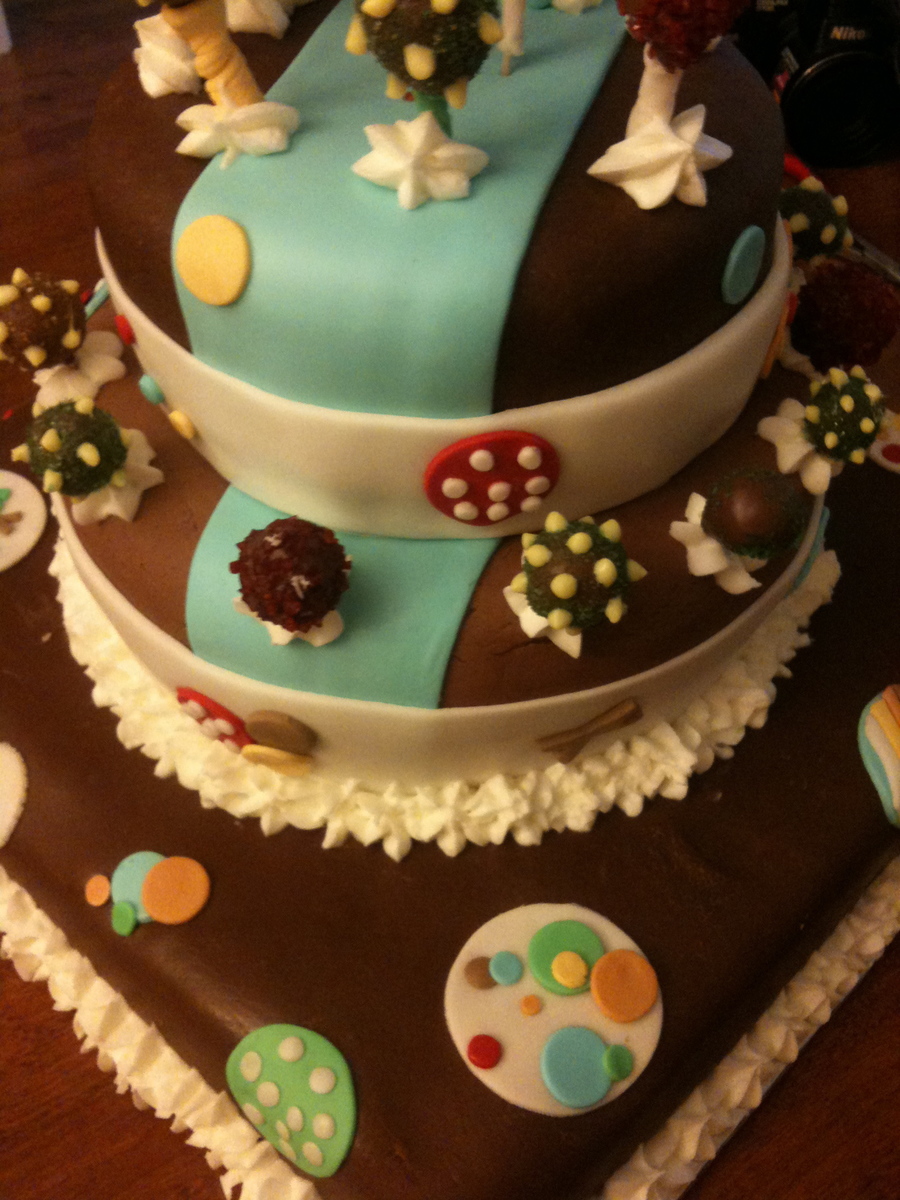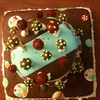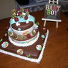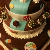 This was a chocolate cake with chocolate butter cream filling. Fondant (Duff's brand from Michael's on the bottom and top) and Marshmallow Fondant in the middle. Some of the decorations were gumpaste. It was delicious!