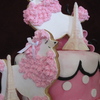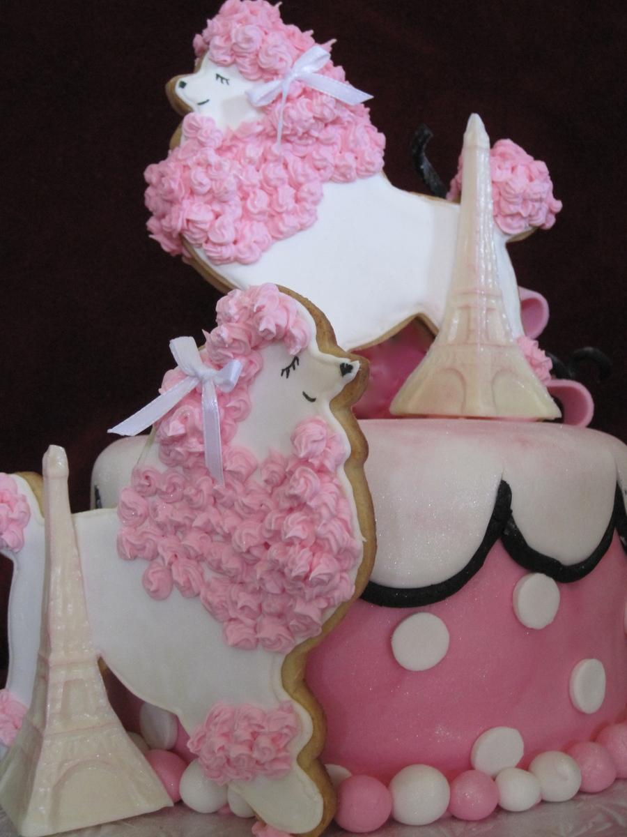 White cake with buttercream frosting covered with Satin Ice. Poodle are sugar cookies with royal icing. Love making these cookies!!! Who knew cookies could be so much fun!!!! First try at cookies.