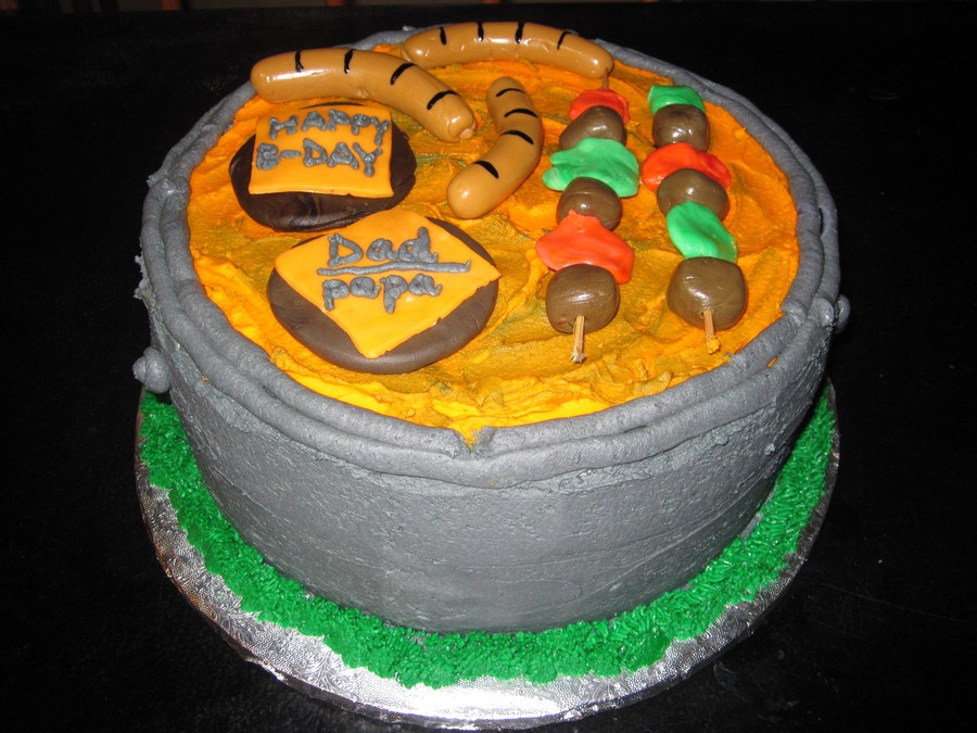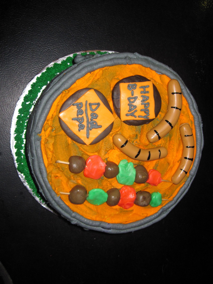 i made this cake for my dad he loves bbq in the summer and since he is born in the summer i siad what better cakr to make him them a bbq cake.cake is red velet with buttercream.cake iced in buttercream allaccents are fondant.tfl