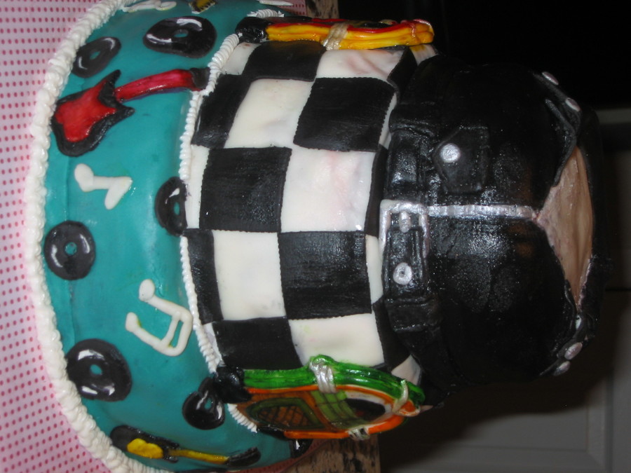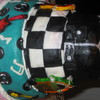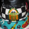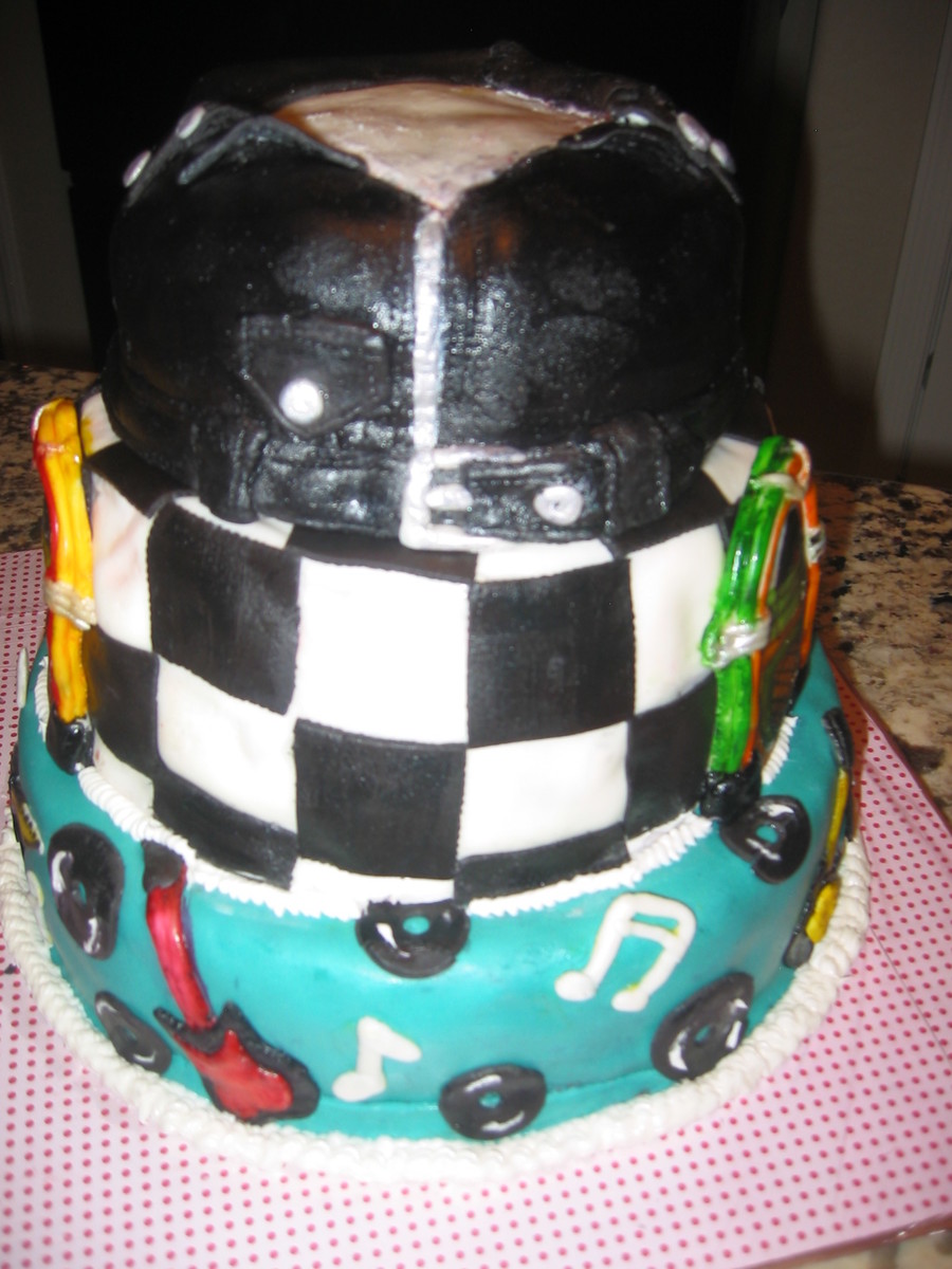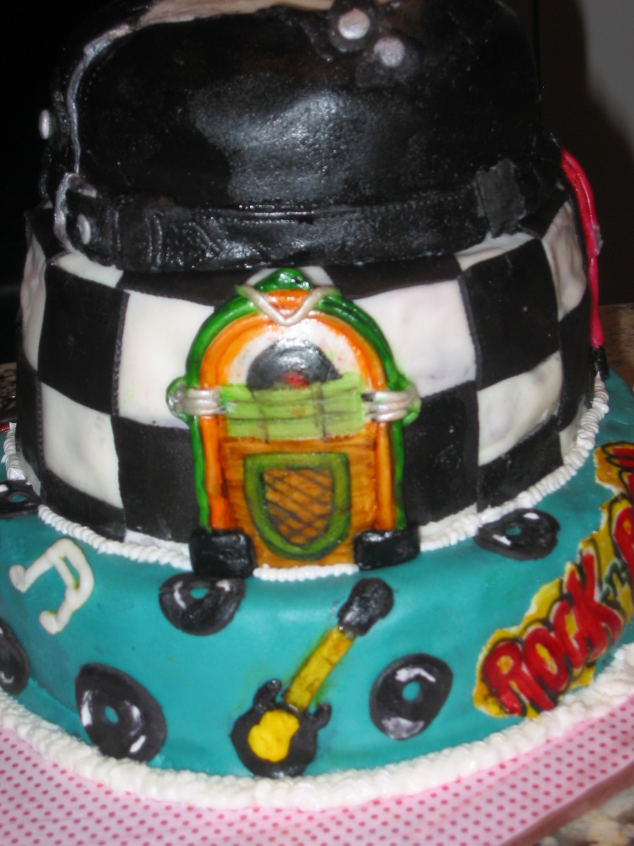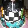 This was a cake I did for a 70th B-day party with a Rock -n- Roll/ 50's type theme. It's a 3 tier stacked cake. The top tier is supposed to be a leather jacket and the other two tiers are rock n roll music symbols, jukeboxes, guitars, and record discs. All tiers are covered in buttercream and then marshmallow fondant.