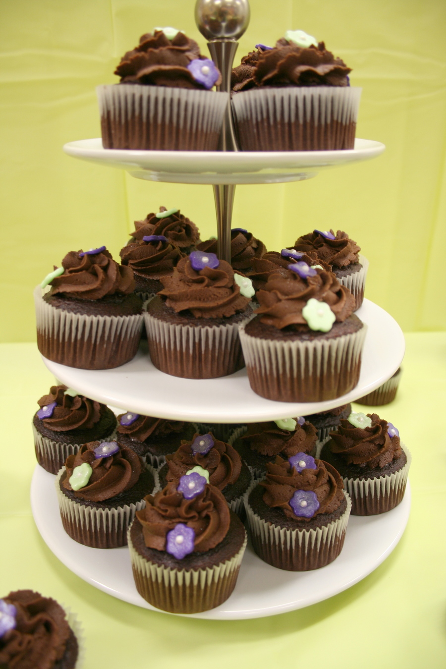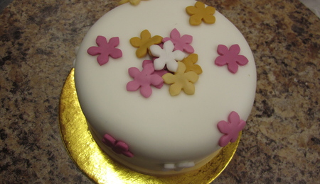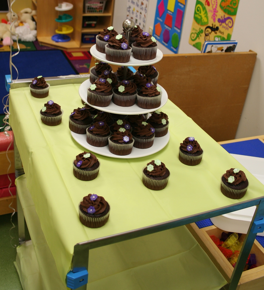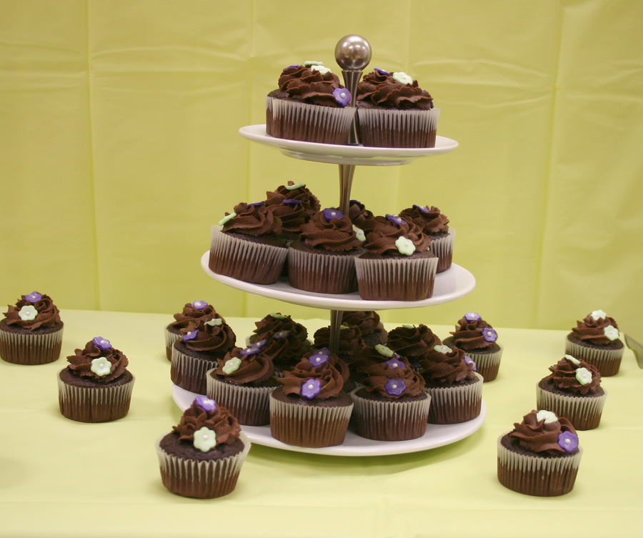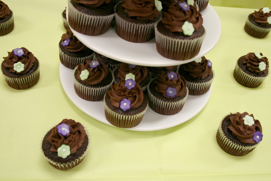 I made these for a little bridal shower we had at work. The flowers are made from fondant and have pearl dust on them and the colors are the bride's wedding colors. (Photographs aren't that great, but they were a big hit!)