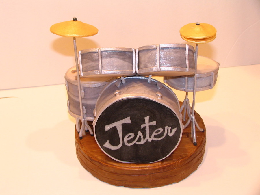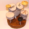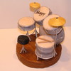 This is a cake topper for a boy who is turning 13. He's the drummer in a band named Jester. All the drums are rice krispy treats covered with marbled gumpaste made to look like his drum set and painted with luster dusts. The stage is styrofoam covered with gumpaste. I needed that so I'd have something to stick the stands for the stool, cymbals and some of the drums into. I just made the topper; mom wanted to make her own cake. This was a lot of fun to make!