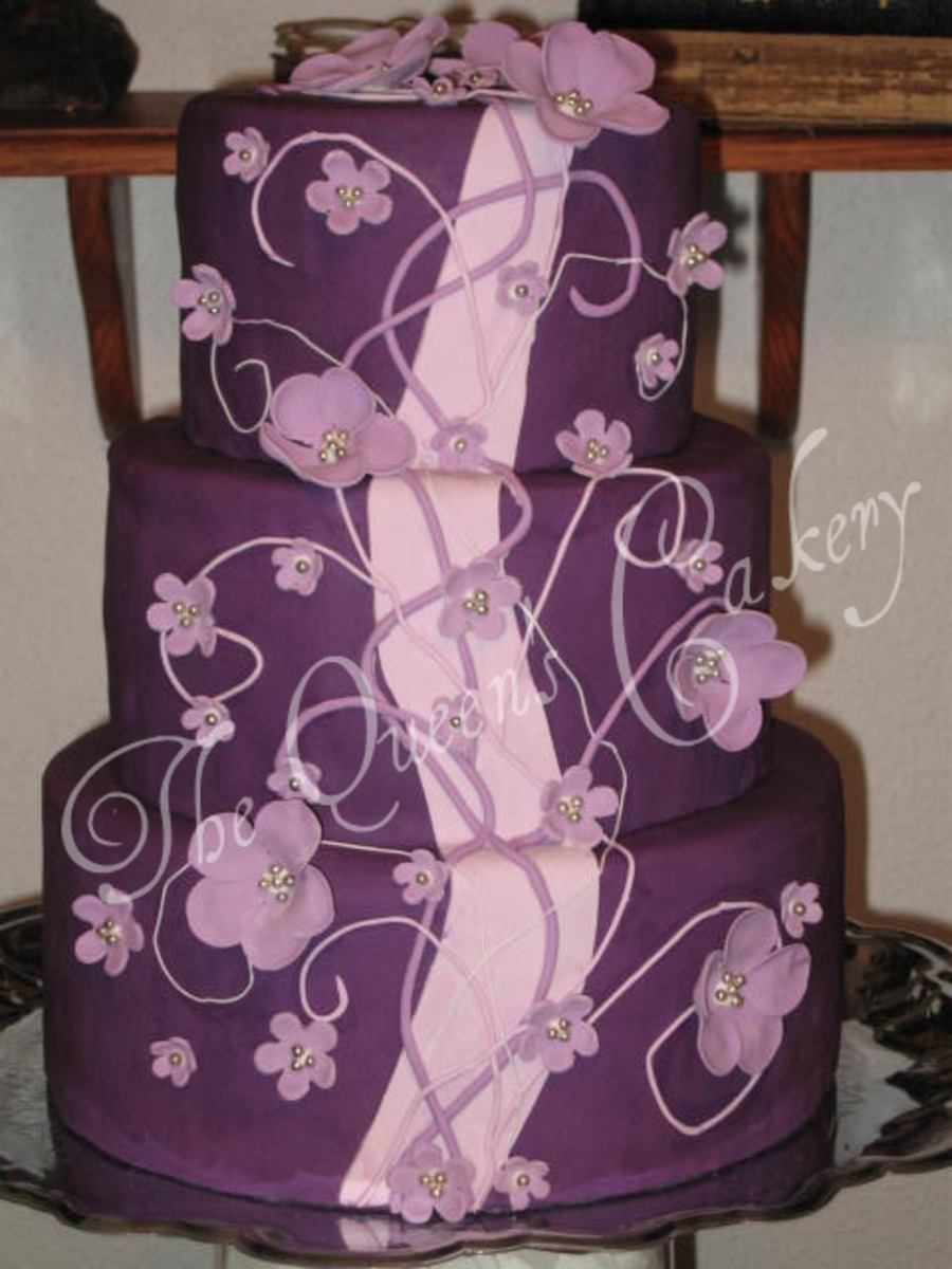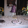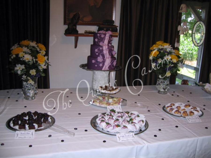 This cake was the centerpiece of a purple and gold-themed 57th Class Reunion reception. The cake was a dummy 6-8-10 covered with fondant and sugarpaste flowers. The dessert buffet included mini cheesecake bites, brownie bites, lemon bars, mini cupcakes, stuffed strawberries, and mini cream puffs. For favors I also did white velvet cookies sandwiched with vanilla dream ganache.