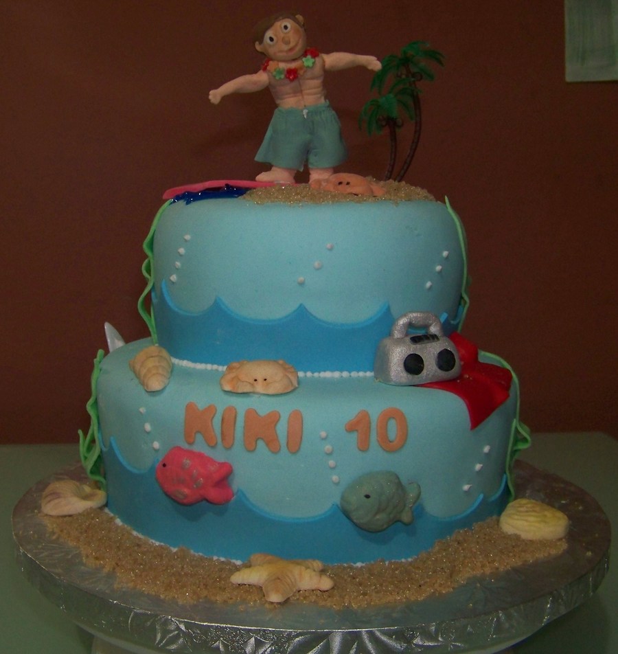 SURFER BOY IN GUM PASTE AND AL;L THE OTHERS ACCESORIES. MY ROLL FONDANT IN CARROT CAKE.