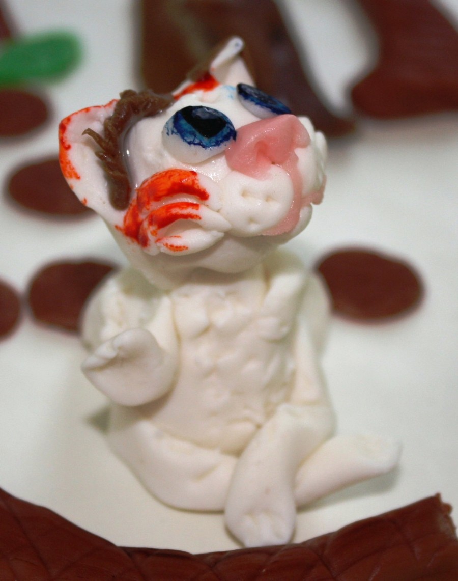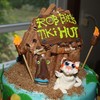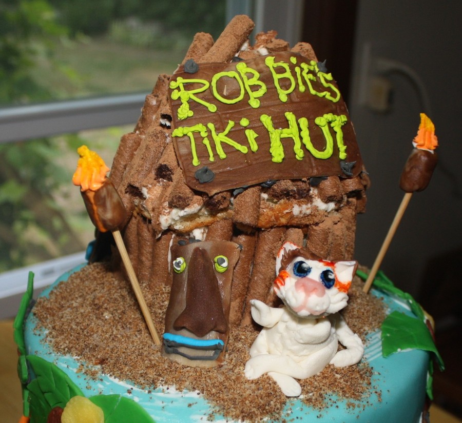 two tiers-chocolate with chocolate pudding filling and vanilla with apricot filling all with bc under Satin Ice hand colored fondant. I am still getting use to making figures and piping letters. The sand is crushed vanilla wafers and the tiki hut is a large cupcake with store bought rolled chocolate cookies. The cat is molded after the birthday boys favorite stuff animal.