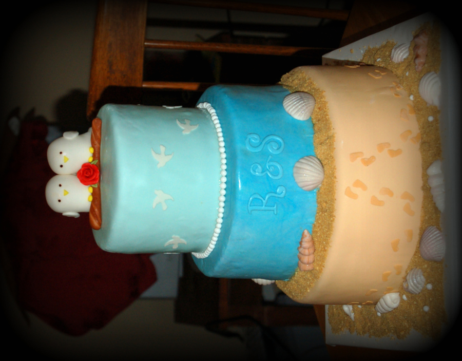 Client wanted sand water air beach cake . Only request was to have footprints in the sand. I did end up adding fish to the water tier ( forgot to take a pic after).