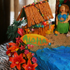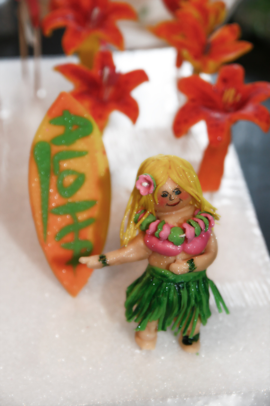 back to school luau,...bottom was strawberry volcano was chocolate.made all tiki huts with rice krispies covered with pretzels tiki bar was strung with lites. everything else was fondant except the little palm trees.