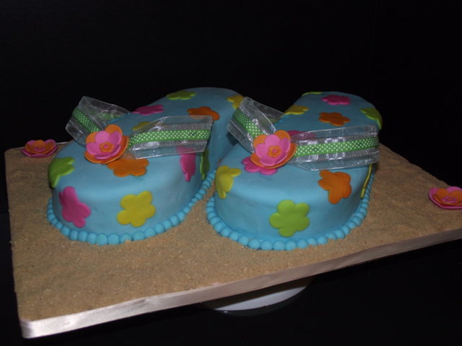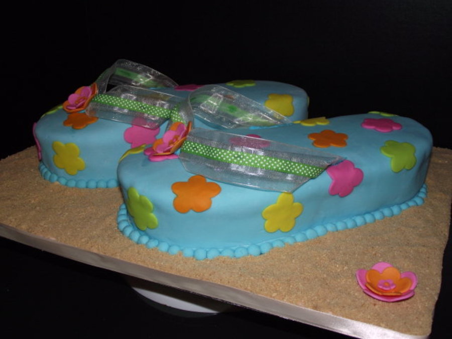 Pumpkin Chocolate Chip cake w/vanilla butter cream covered in fondant. Gum paste flowers and brown sugar and graham cracker crumbs for sand. Only thing not edible on cake was the flip flop straps which were made out of ribbon. Thanks to previous CC members for there designs and my source of inspiration!