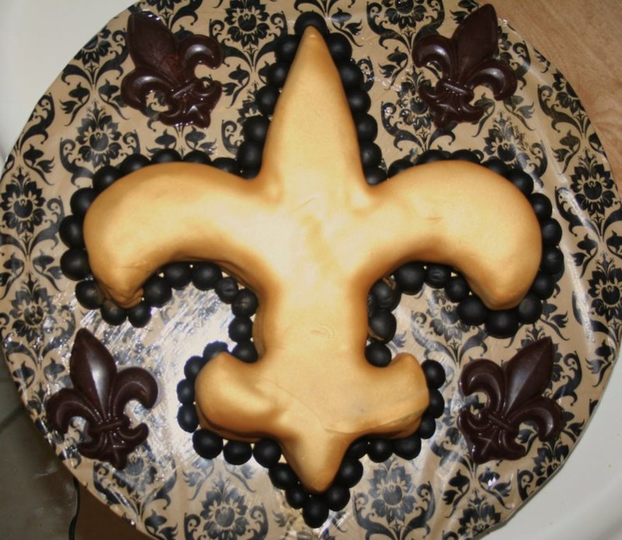 Chocolate cake with caramel bits. fondant with caramel added in. chocolate fleur de lis.
