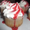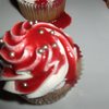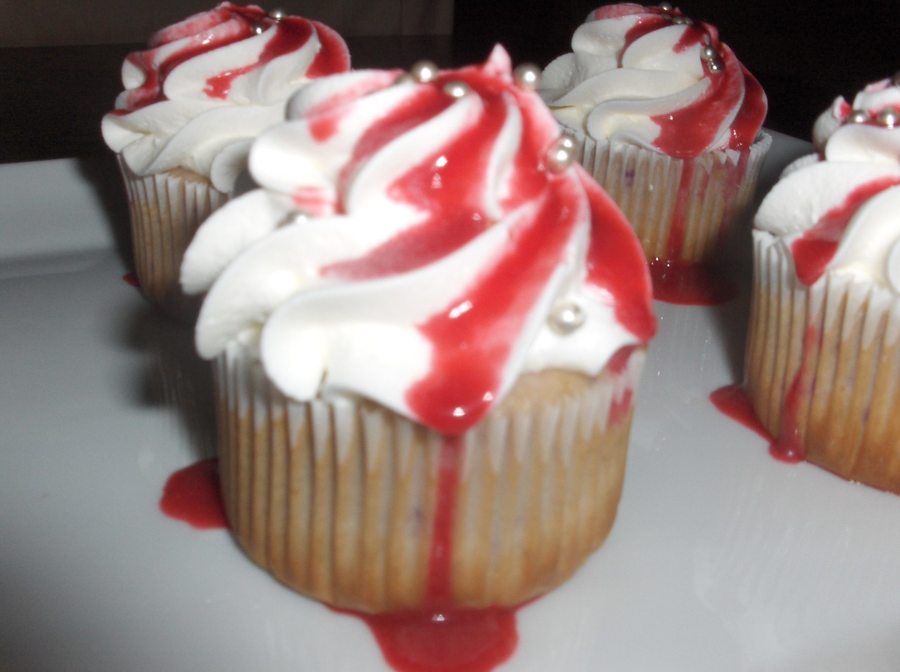 White cupcakes with fresh raspberries baked inside, whipped cream icing, fresh raspberry sauce, topped with silver dragees.