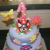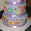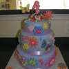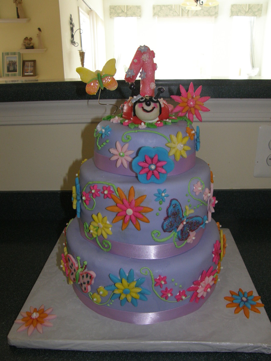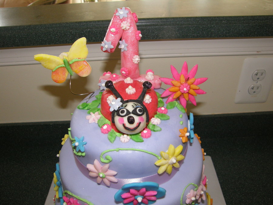 3 tiered purple fondant cake with fondant lady bug and flowers
