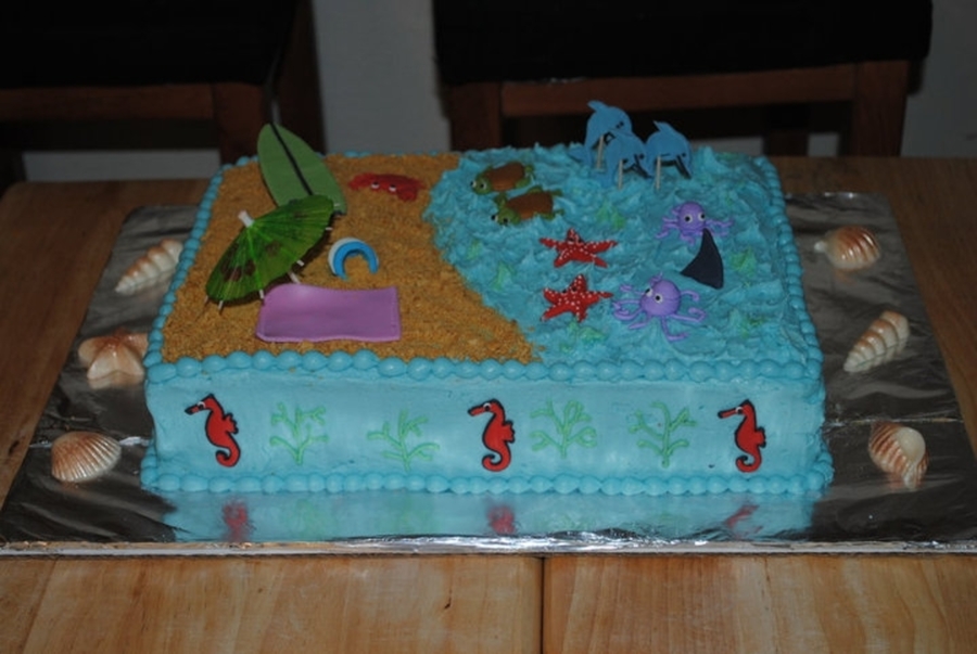 Frosted in buttercream, graham cracker "sand", royal icing and fondant creatures. The only thing that is inedible is the umbrella.