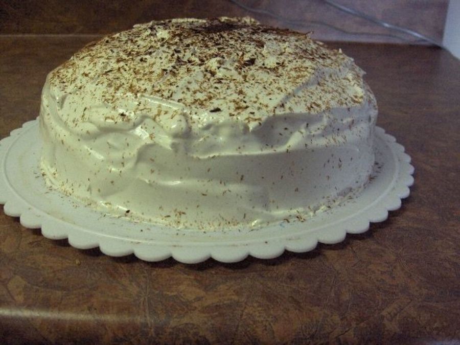 White cake with egg white whipped icing, very fluffy! On top is shaved dark chocolate.