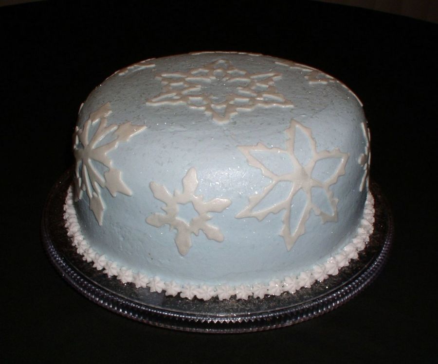 The snowflakes were made from MMF using some snowflake cutters I bought at a local decorating supply store. They come in a tin box with three different sizes of snowflakes and two little cutters to cut out the insides in whatever pattern you choose. I was glad to see that it also came with some examples because I wasn't sure what to do at first. This cake was one of the easiest I've ever done, yet got one of the biggest reactions. Isn't that always the way?
