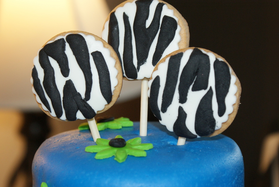 NFSC cookie with fondant zebra print...on sticks. I used these cookies as a topper for a cake.