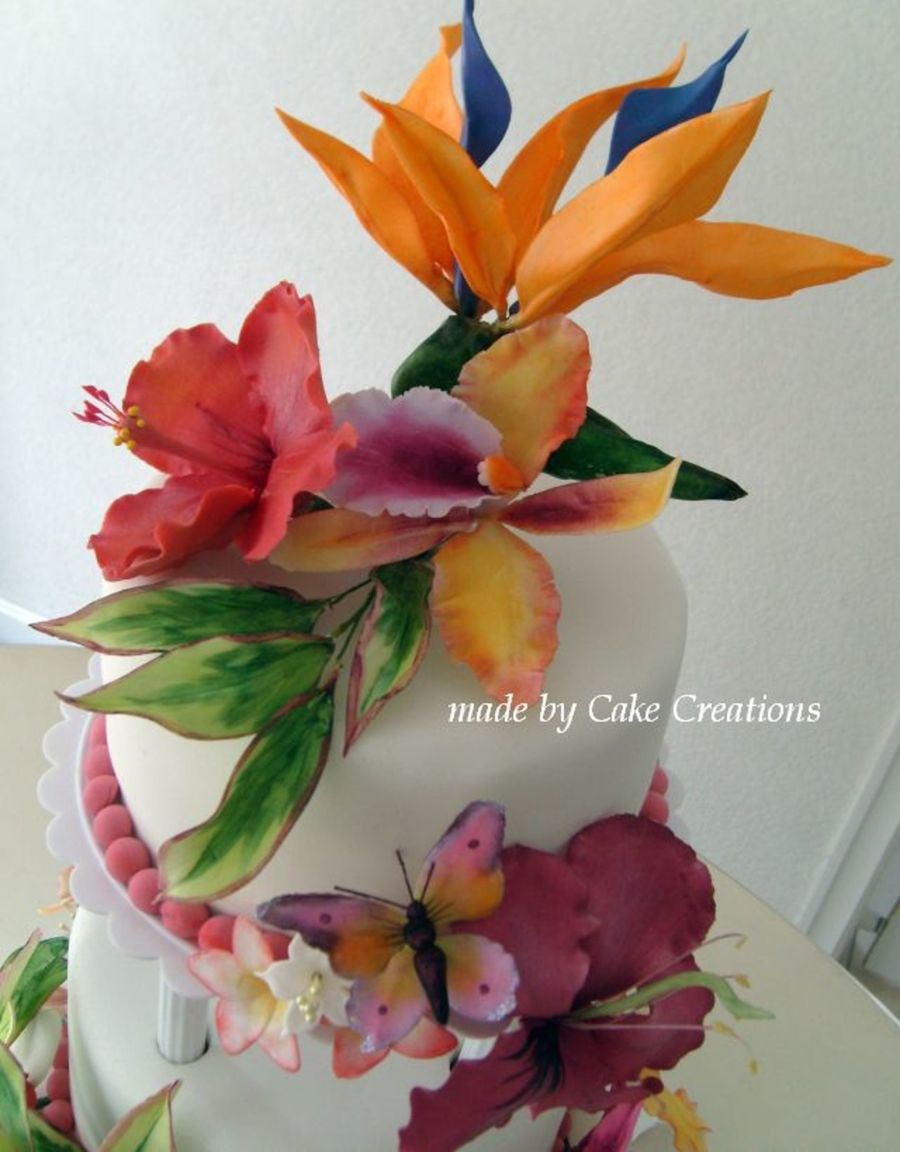 Bride wanted a tropical wedding cake with a Bird of Paradise on top. Lemon cake, filled with cherry cream, raspberries and pinapple respectively. All flowers and butterflies made from gumpaste Thanks for watching!